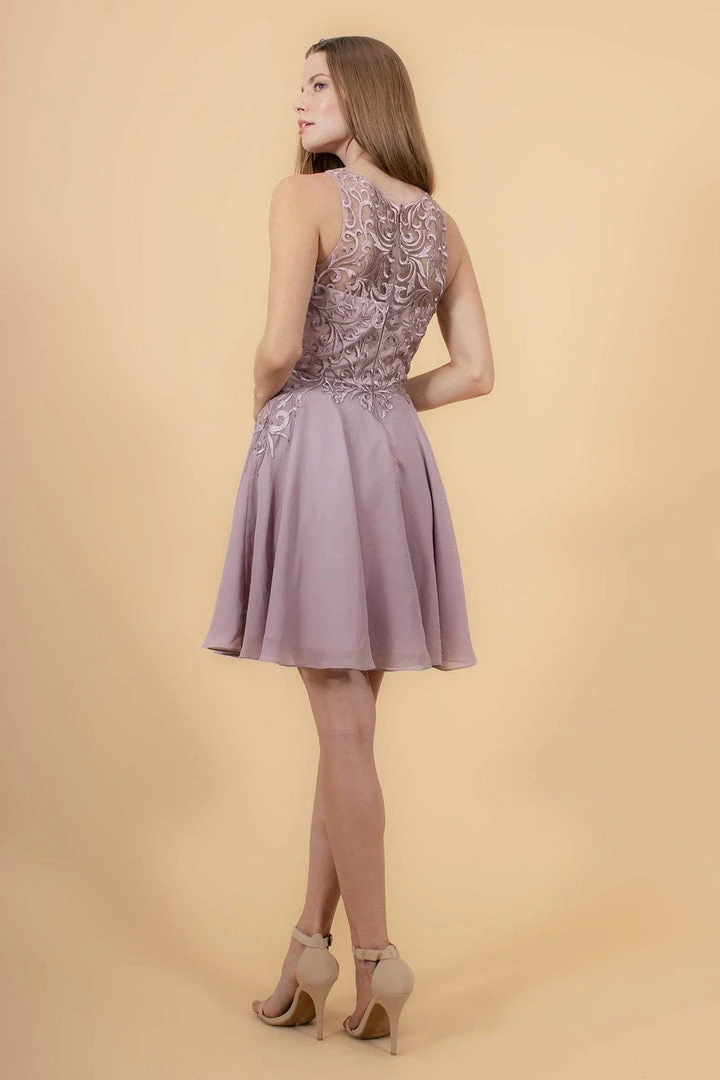 | Details: | Sleeveless, Embroidered Swirl Pattern, Rhinestones, Semi-Illusion Back, Back Zipper Closure, Short Hem |