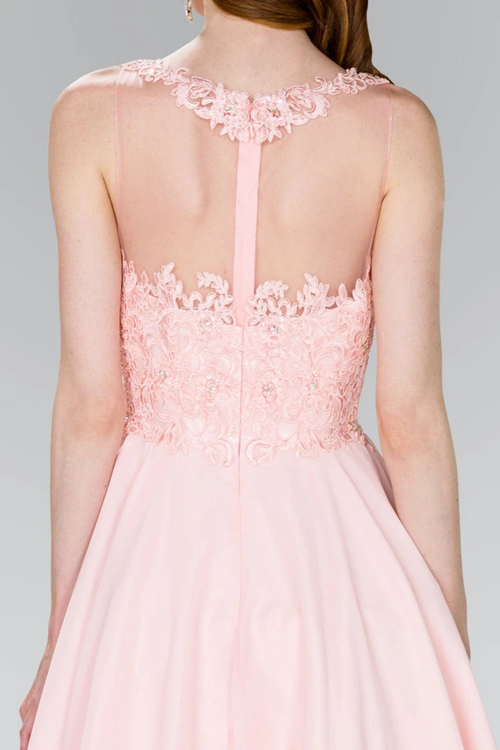 Capture that striking presence and get everyone’s attention in Elizabeth K GS2394. Portrays a sleeveless, scoop neckline with sweetheart lined bodice adorned with lace appliques. The sheer back has a zipper closure while the chiffon skirt opens in a mid-thigh A-line silhouette. Be ready to fascinate everyone with this Elizabeth K dress.