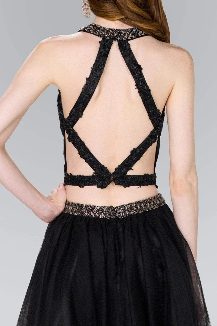 Look chic and seductive in this marvelous two piece by Elizabeth K GS2398. Features a sleeveless, halter neckline with sheer sweetheart lined crop top adorned with lace appliques. The back shows off a sexy cutout while the tulle mid-thigh A-line skirt finishes in a curled hemline. This Elizabeth K creation is a classic look that works for many special occasions.