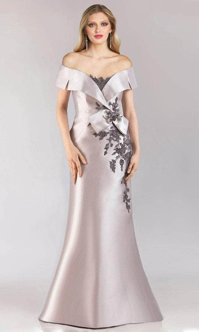 You’ll be the talk of the town in this Feriani Couture 18213 masterpiece. This gown is crafted in a metallic fabric and features a beautiful off-the-shoulder neckline and a semi-sweetheart bodice. With paneled sleeves, embroidery inset at the bust and applique on the fitting bodice, this gown is more exciting with its huge bow detail laying on the natural waist. The back has a concealed zipper at the center for a perfectly-fitting style. While falling to a full-length hem, the skirt flaunts a trumpet silhouette. As you enter the hall, this Feriani Couture masterpiece will draw attention to you. Model is wearing Blue, and Silver colors.
