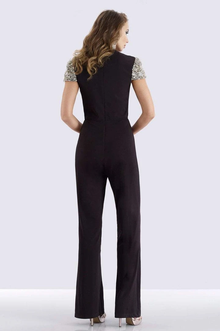 Be the delight of his eyes as you sparkle with beauty in this glamorous Feriani Couture 26253 creation. This long jumpsuit showcases a deep v-neckline while being framed with bejeweled short sleeves. The lower bodice is gathered with soft pleats at the center and is accented with a beaded waist detail. Straight pants flow down along the legs for that elegant full length finish. Show your trendsetting style that will cement your style star status in this Feriani Couture look.
