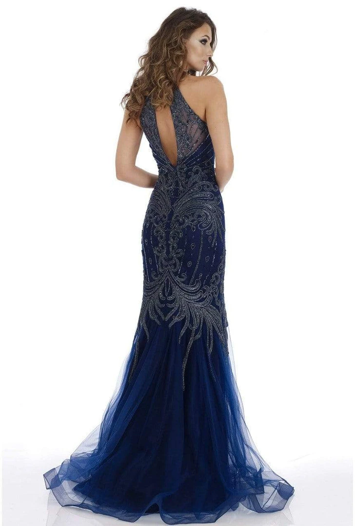 Reach the stars while looking so opulent in this Feriani Couture 26286 creation. Impressively festooned in an intricate display of beaded scroll motif, this immaculate piece flourishes an illusion high halter over a sweetheart neckline. Defined with a cut-in design and a sheer racerback with a plunging cutout, the trumpet skirt is frosted with beadwork before a stream of sheer flare ends its full-length silhouette with a train. Look and feel like a million bucks in this romantic Feriani Couture masterpiece. Model is wearing the Navy color.