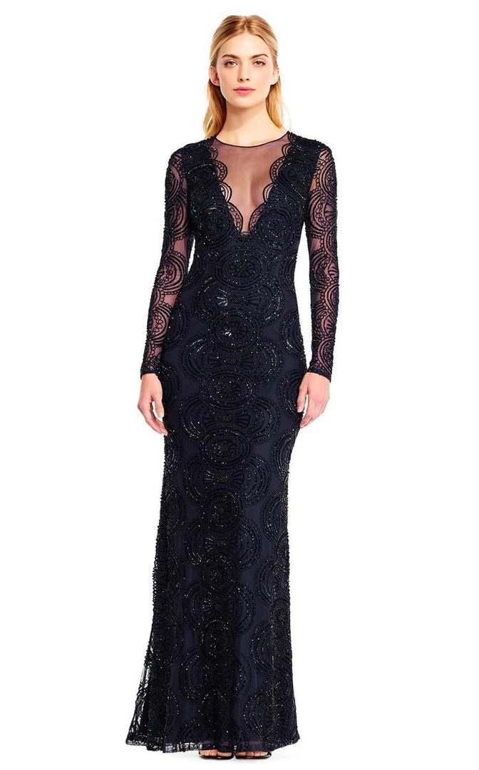 Revel under the brilliant limelight as you draw all eyes to your magnificent style in this Aidan Mattox MD1E201413 creation. Beautifully translucent as intricate medallion-like beadwork festoons the entire silhouette, this stunner features a jewel illusion over a plunging v-neckline as slender long sleeves display lush ornaments. Accented with a diamond cutout at the back, the sheath skirt sparkles as it cascades spectacularly down to a full-length hemline. Inspire admiration as you dominate the night with your pure elegance in this Aidan Mattox masterpiece. Model is wearing the Twilight Black color.