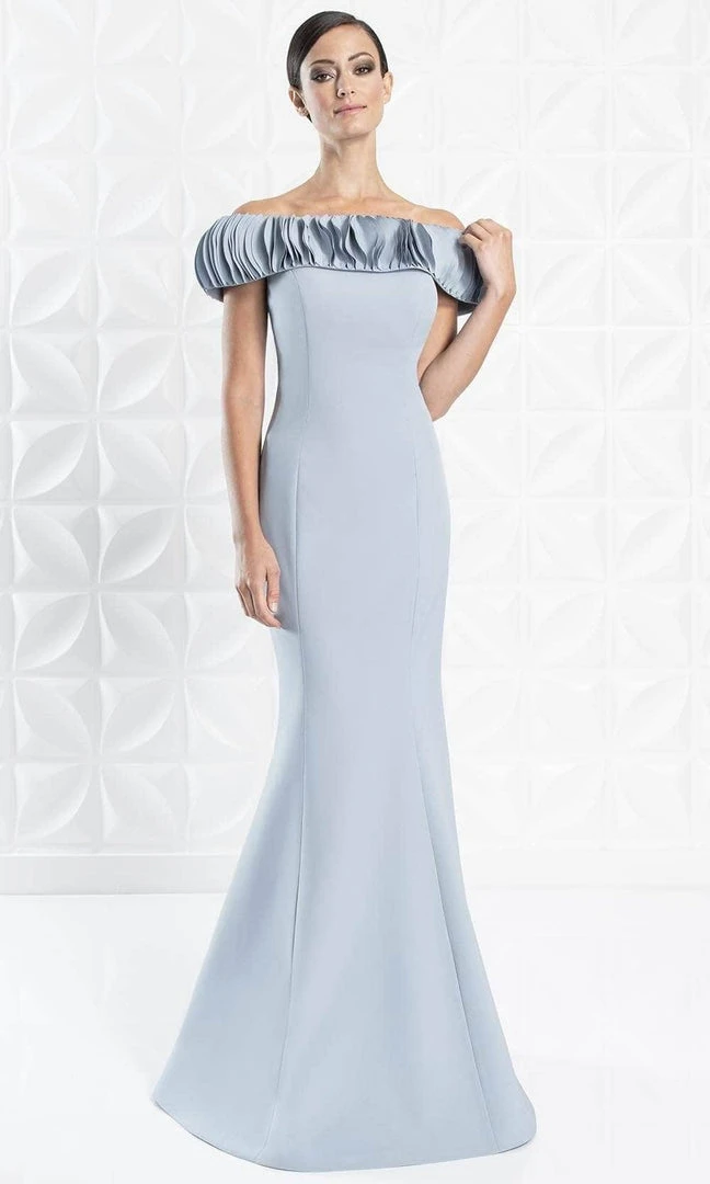 This long special occasion gown boasts a ruffled off-shoulder neckline that everyone will be talking about. Tailored to skim a flattering curves, the bodice is sculpted with princess seams as it gracefully leads to the floor-length trumpet skirt. Model is wearing the Glacier Blue color.
