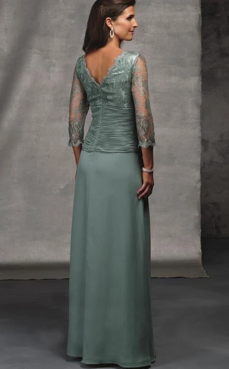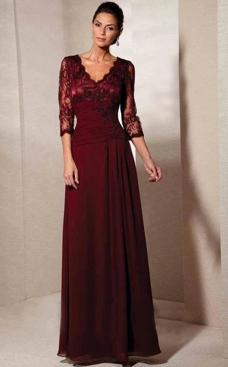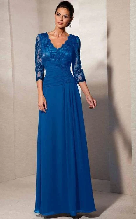 Look and feel glamorous in this evening gown by Alyce Paris Black Label 29364. Subtle beads and floral lace overlay the gown’s ruched bodice. This is perfected by a V-neckline emphasized with scallop lace trim. The V-shaped back reflects the lavish front design. The coordinating sheer lace sleeves look opulent. The ruched waist fashions a soft silhouette. The smooth A-line skirt delicately gathered near the waist and cascades to the floor. This chiffon and lace creation from Alyce Paris Black Label collection is a must have. Model is wearing a Burgundy, Blue Coral, Pale Jade, and Stone color.