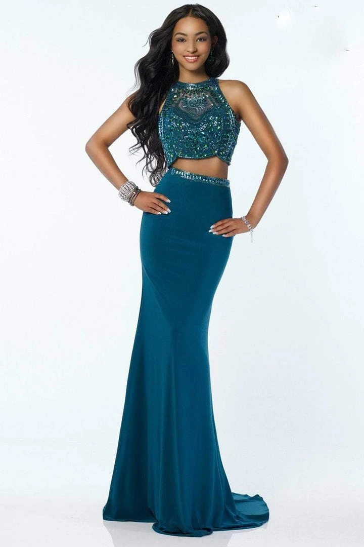 Two piece jersey skirt with a stunning embellished halter top with a large keyhole on the upper back.