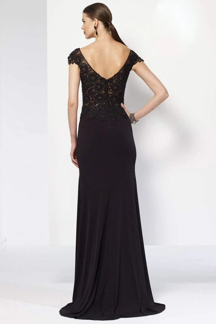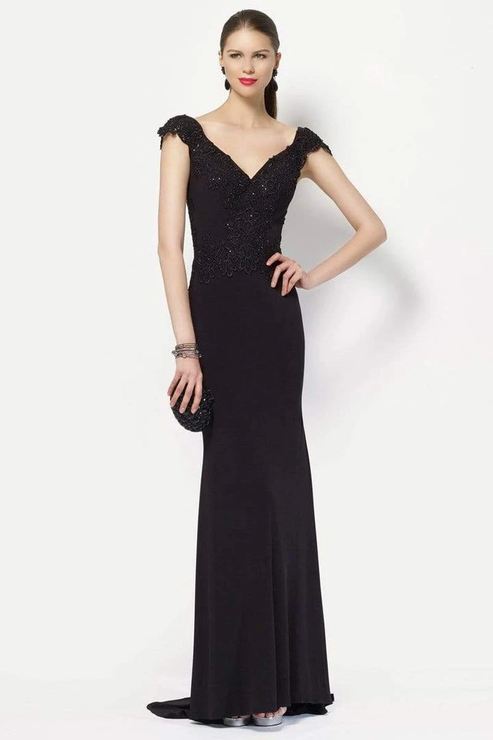 Stunning long jersey gown with a small capped sleeve, v neck laced bodice and a mid open back.