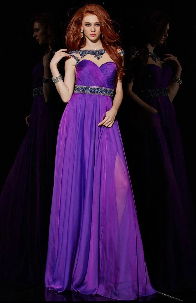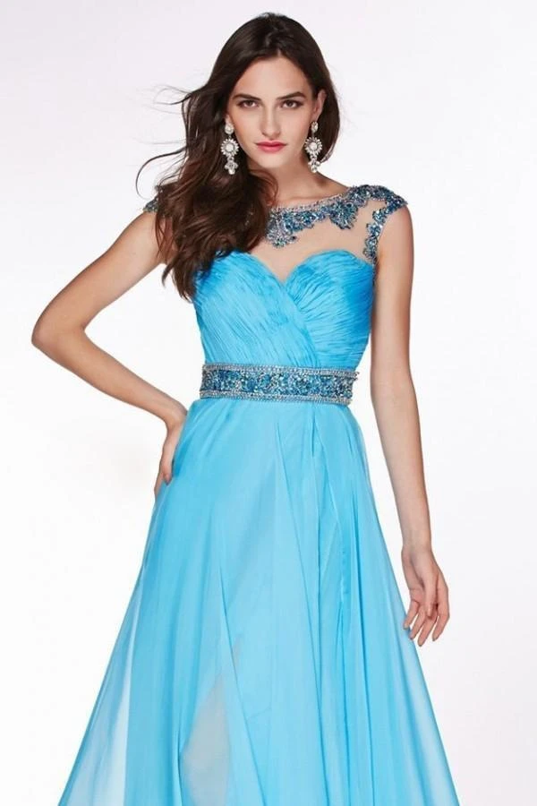 From the spring collection comes this lovely formal dress for any occasion. It is floor-length, with a brightly decorated waistline and neckline and a partially sheer, heart-shaped bodice. The bottom of the dress is flowing, allowing easy movement while still looking elegant.