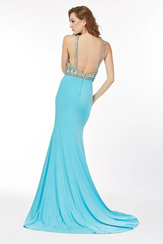 This stunning floor length halter dress will be the most glamorous dress at your prom. The halter bodice is detailed with embellishments, which adds a nice feminine touch. Pair this halter dress with silver drop earrings, and you will be all set for a night to remember.
