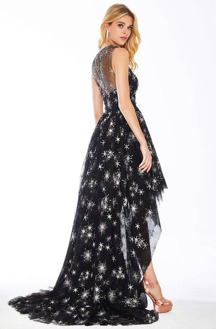Show off your playful side in this star embroidered hi-low evening dress by Ashley Lauren 1333. The chiffon fabric is embroidered with modern stars which are then adorned with crystals. Showcases a sleeveless, illusion jewel neckline with a fitted bodice. The A-line skirt has a high low hemline and finishes in a sweep train. Surround yourself with sparkle of glamour when you walk in this dazzling Ashley Lauren piece.