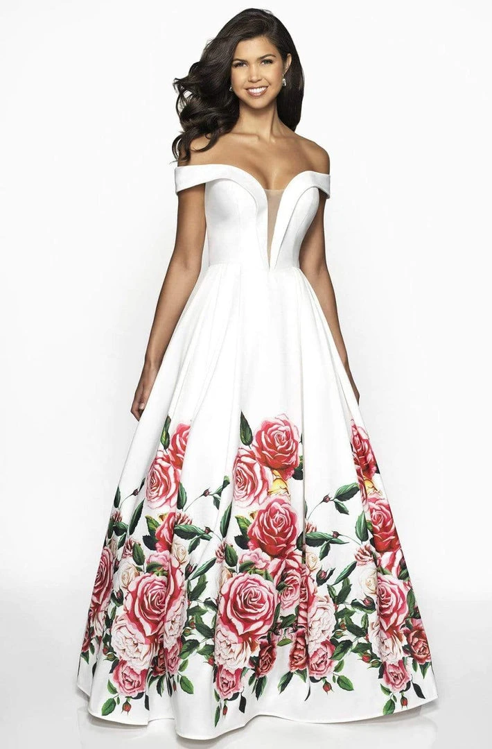 Show off your feminine side with this beautiful Blush by Alexia Designs C2062 evening dress. The fitted bodice showcases a folded plunging off-shoulder neckline adorned with sheer inset detail at the bust complemented with a wide mid-open V back. Colorful floral prints jazzed up the pleated ballgown skirt, which is certainly to catch all eyes as soon as you walk into the room. This amazing Blush by Alexia Designs is indeed another awesome creation.