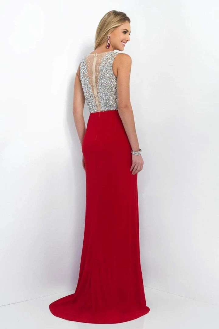 Be red carpet ready in this stunning evening dress by Blush 11009! This glamorous sleeveless jersey knit sheath features a sheer illusion bodice encrusted with AB stones and crystals and a form fitting skirt that hugs your best curves and falls into a slight sweeping train. Look good and feel good with this grandiose design from Blush!