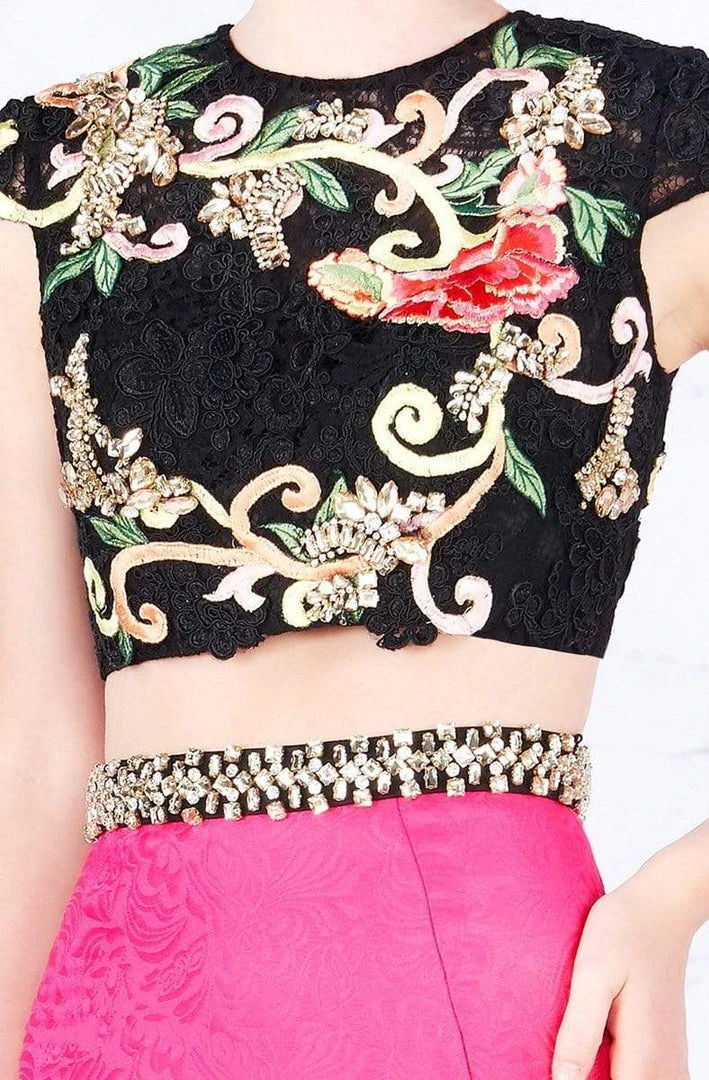 Let this Cassandra Stone 40904 take you to any party in style. This fabulous two piece dress offers a fitted bodice adored with lace appliques framed with a jewel neckline and cap sleeves. The rhinestone waistline around the skirt comes past the belly button which leads to the trumpet silhouette that tapers to full length finished with a sweep train. The full back is secured with a center zipper closure detail. This special occasion Cassandra Stone dress is all about the latest style trend.