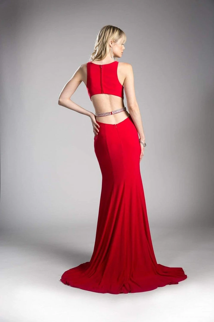 Bring an element of allure that captivates in this Cinderella Divine 62806 creation. Crafted in a stretch knit fabric showcasing bold tones, this chic piece shows a jewel neckline on a sleeveless bodice with a peaked illusion front panel. Crafted with a back defined with a notched low open back traversing to gorgeous side cutouts. Crowned with a beaded inverted basque band, the sheath skirt has illusion panels that cascade down to the floor along with a sweep train. Glow with immaculate poise in this impeccable Cinderella Divine masterpiece.