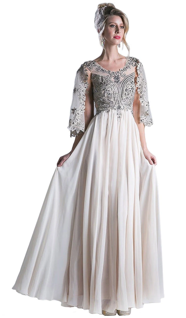 Make yourself into a vision of loveliness in this spectacular evening dress by Cinderella Divine ML404. The embellished bodice features sheer cape sleeves with beaded appliques and scoop neckline. The dreamy skirt flows with layers of fabric and shirring to showcase an A-line flare with a full-length hemline. Truly this creation by Cinderella Divine is the definition of chic and classiness.
