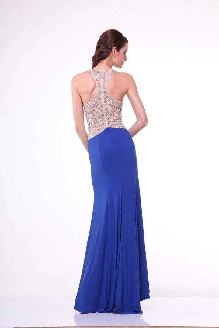 Look brilliant for your special event wearing Cinderella Divine 8752. Brandishes in a sleeveless, illusion halter neckline with fitted bodice bedecked with glittering embellishments. The racerback has a zipper closure and forms a full length sheath skirt with sweep train. Make an extraordinary statement when you walk in this classy Cinderella Divine dress.