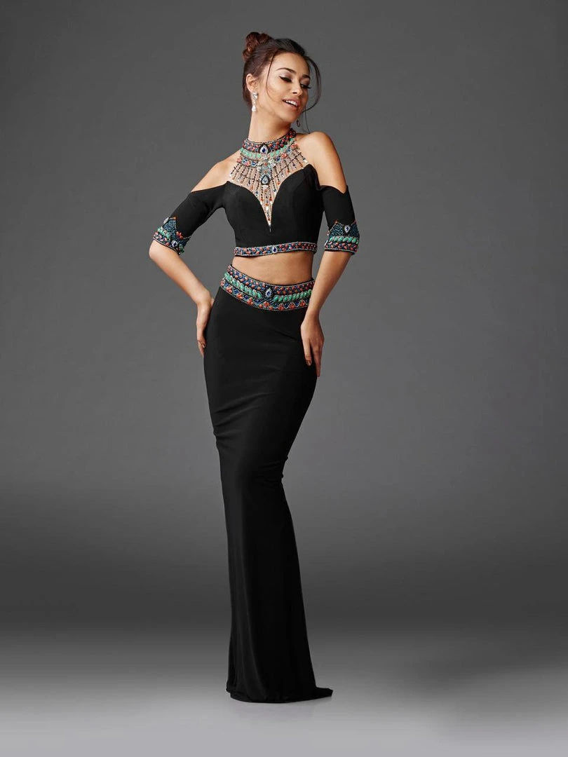 You cannot go unnoticed in this evening gown by Clarisse 4920. This two-piece gown boasts an elbow sleeves bodice with an embellished high neckline, a cold shoulder detail and an open back. Below the embellished waistline, the sheath silhouette skirt glides to full-length hemline. Truly this design by Clarisse is the definition of chic and classiness.