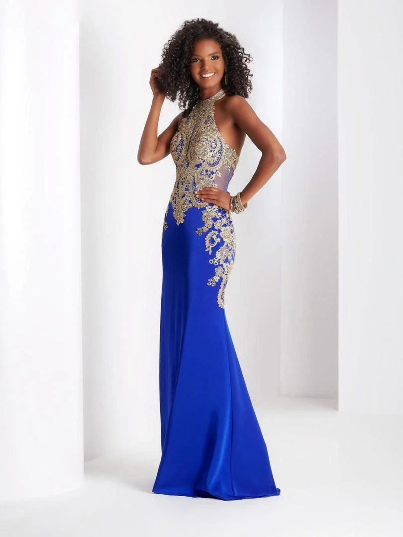 Look sophisticated and classy with this dress by Clarisse 4962. A stunning embroidered dress designed with a halter neckline. This dress features illusion details revealing a sweetheart shaped bodice. At the back provides a bold approach with back cutouts for that skin revealing look. Get noticed in this radiant dress from Clarisse.