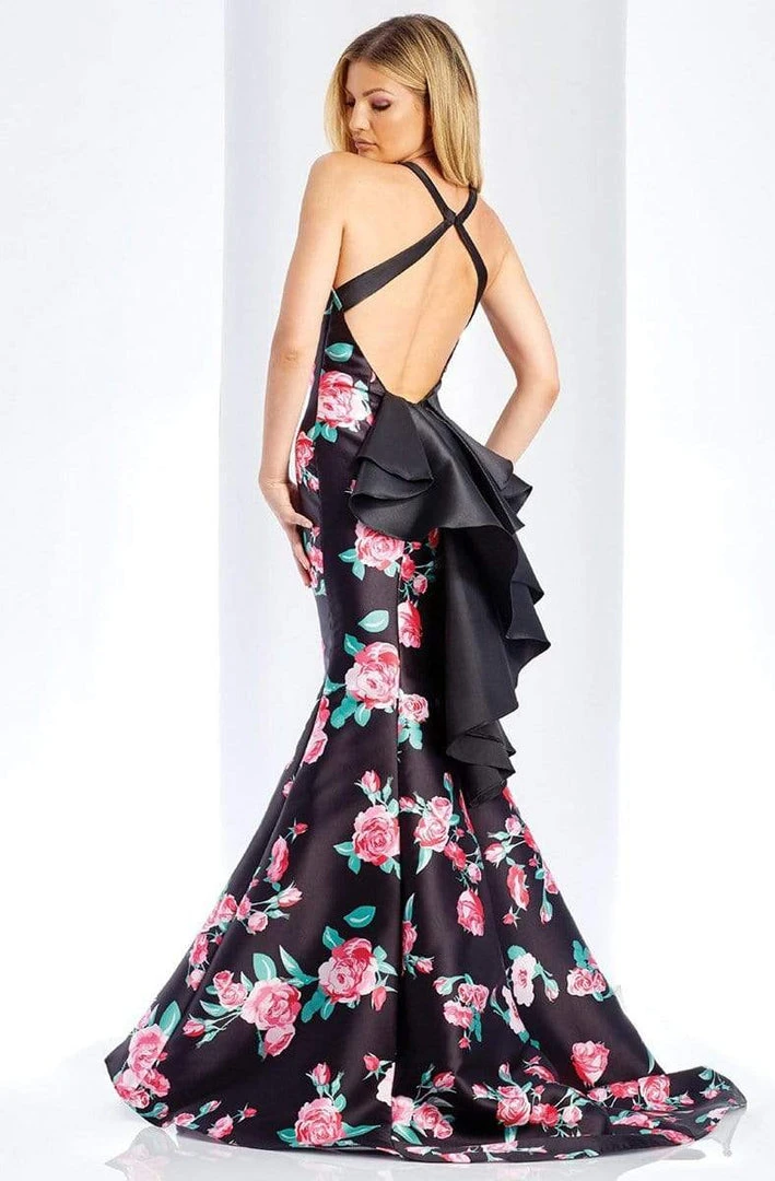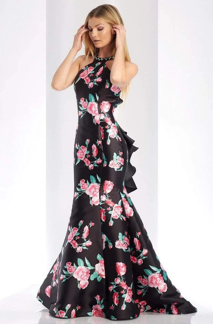 Glamour gets gorgeous with this romantic rose print prom dress by Clarisse 3421. The bodice has a halter neckline adorned with sparkling beads and extend in a strappy open back that plunges to the waist. Cascading solid black ruffles at the waist flow to the knee and add an effortlessly feminine touch. This bold and stunning Clarisse masterpiece is sure to get you noticed.