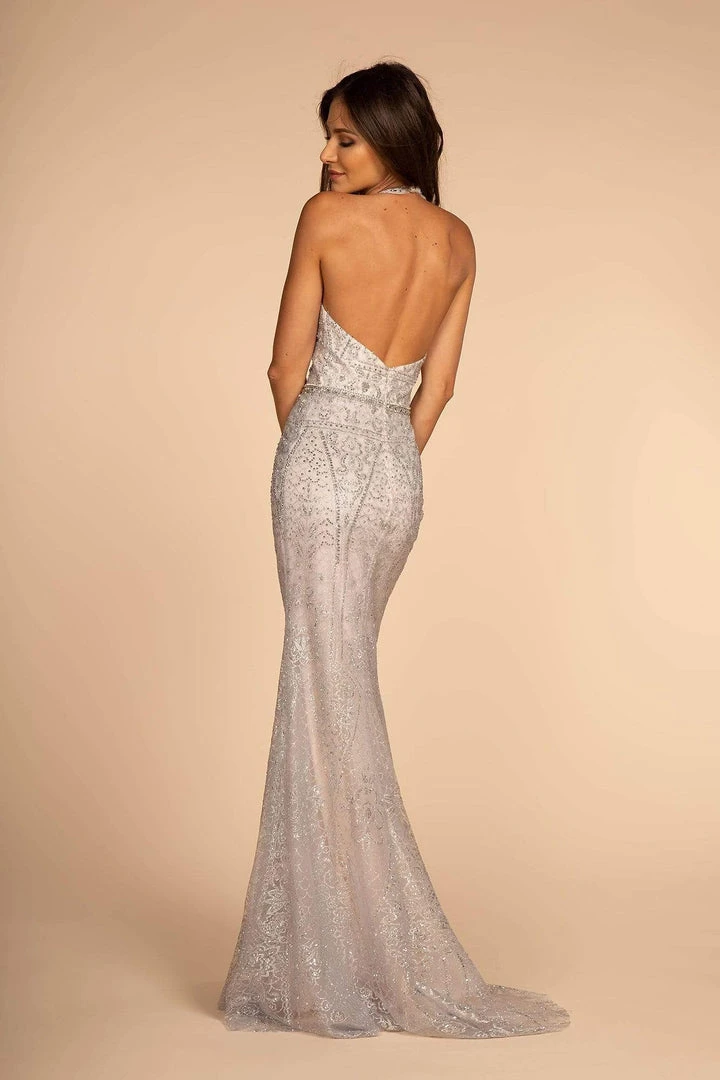 You will be positively radiant in this glimmering masterpiece by Elizabeth K GL2642. The fitted bodice is designed with a halter neckline complemented with an open back. Striking bead and sequin embellishments adorn the whole ensemble as beaded belt accents the natural waist. This dress reveals a sheath silhouette that flares gorgeously to the floor completed with a sweep train. Be dressed up classily in this Elizabeth K ensemble. Model is wearing Gray color.