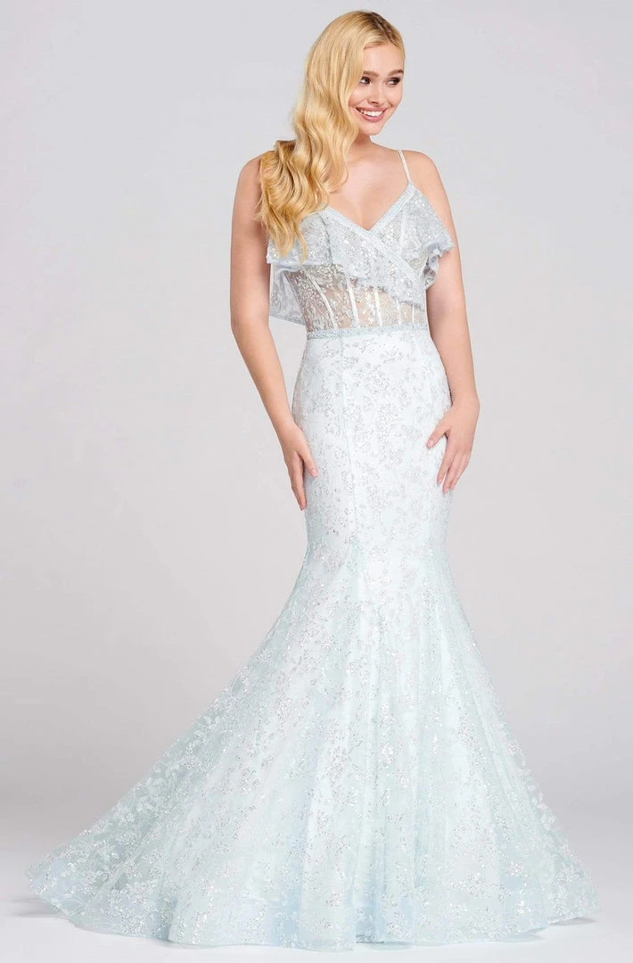 Be one of the best dressed lists with this Ellie Wilde EW120082 evening gown. The whole dress is designed in sequin tulle as the fitted corset bodice features a V neckline with ruffled detail, supported with spaghetti straps which lead to the mid-open back. The skirt parades a trumpet silhouette, which flares stunningly to the floor, completed with horsehair hemline and sweep train. This Ellie Wilde dress is sure to be an attention-grabber in any occasion.