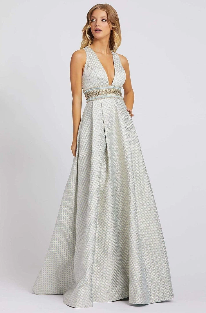 Mesmerize with your poise and beauty while being sheathed in this fabulous Ieena Mac Duggal 26107 creation. Artistically textured with a stunning geometric lattice motif, this stunner shows a plunging v-neckline on a sleeveless bodice. Crafted with a full back and a beautifully bejeweled empire waist, the A-line skirt flares amazingly down to a subtle train. Embrace your newly found sophistication in this exquisite Ieena Mac Duggal masterpiece.