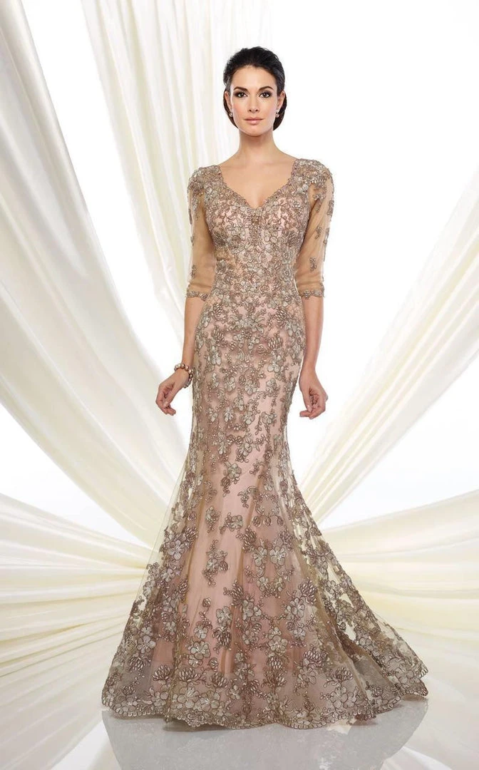 Captivates in a V-neckline with sheer quarter length sleeves. Made of lavish beaded lace, the fitted bodice forms a full length mermaid skirt with a sweep train finish.Â