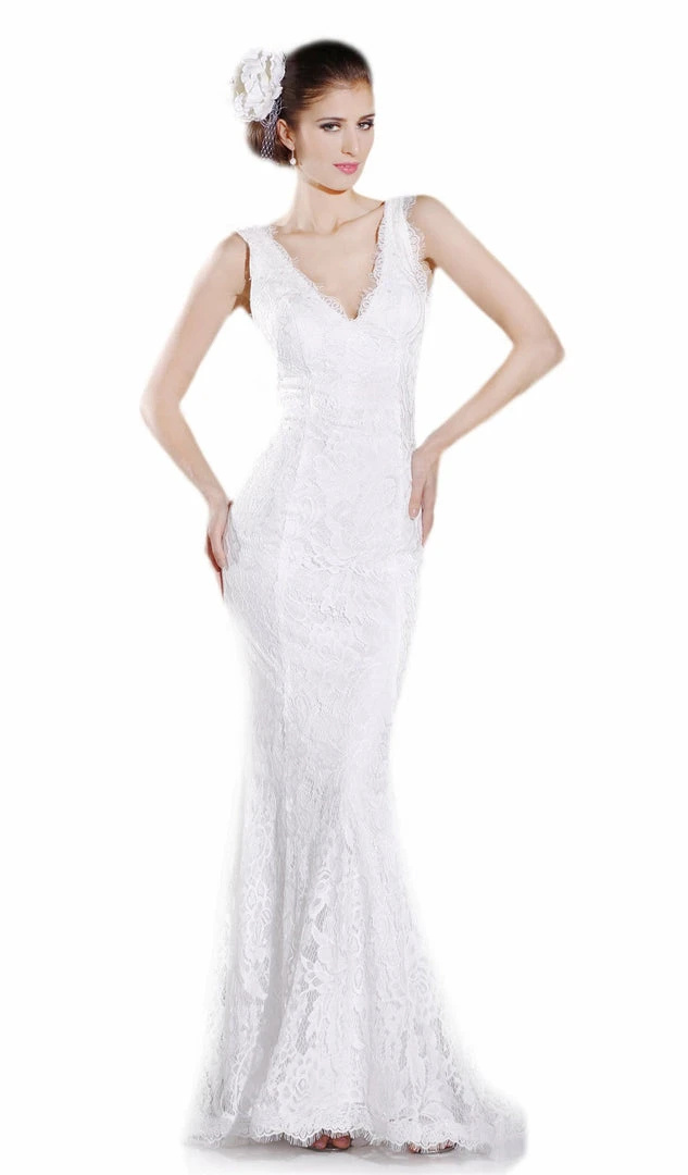 | Details: | Sleeveless, Plunging neckline, Fitted bodice, Trumpet skirt, Sweep train |