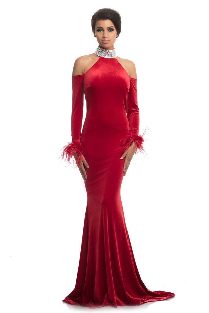 Radiate class and poise as you channel red carpet glamour wearing this evening gown by Johnathan Kayne 9015. This long formal evening dress is fabric in vibrant stretch velvet, featuring a halter style embellished high neckline, cold shoulder cut out and long sleeves with faux feathers on the cuffs. The long skirt is fitted on the hips and flare from the knee down into the floor cascading to a mermaid silhouette. You are sure to spice up the evening on the red carpet in this fabulous Johnathan Kayne creation.