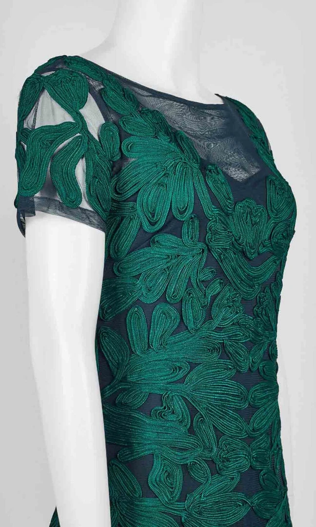 Look sophisticated and classy in this long formal dress by JS Collections 866747. Stunningly crafted with beautiful soutache embroidery, this long special occasion dress showcases a sheer bateau neckline and short sleeves while flaunting a V shaped back. The skirt displays a sheath silhouette that falls to full-length with high slit at the back for more leg movement. Charm them all in this classy piece from JS Collections