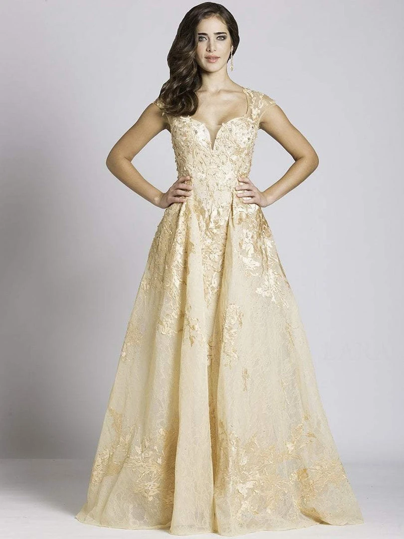 You’re e a picture of perfection in a defined gown from Lara 33497. This glamorous design features a pronounced sweetheart neckline with sheer inset at the bust and sheer cap sleeves. Ornate floral applique streams throughout the dress creating a serious texture. Pleats shape the A-Line skirt at the waist, opening to opulent ripples and a flared full-length. The sheer back has center zipper closure that secures this dress for a perfect fit. Step out in style wearing this Lara evening gown.