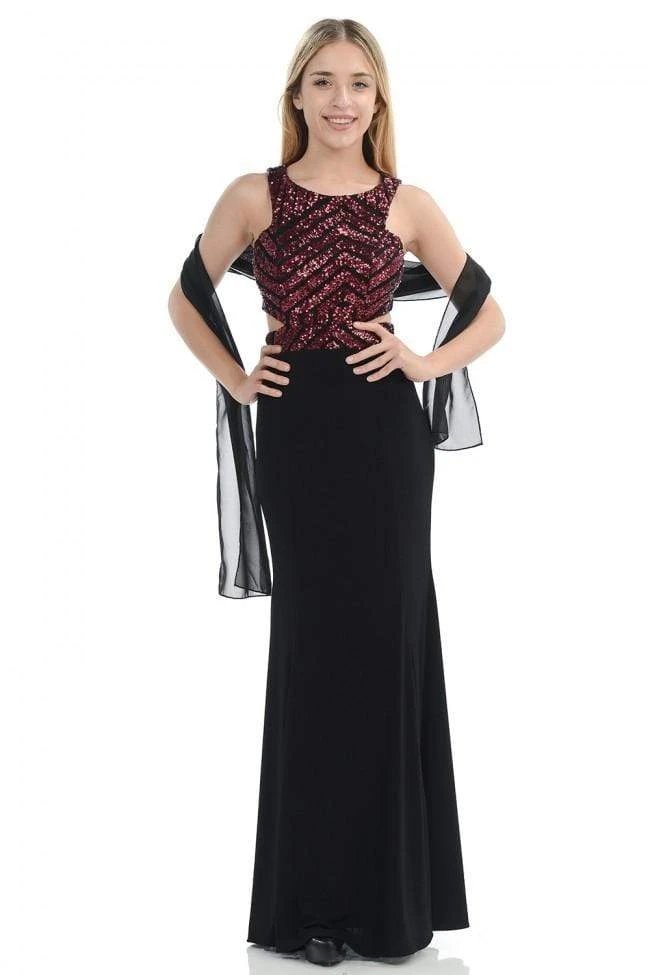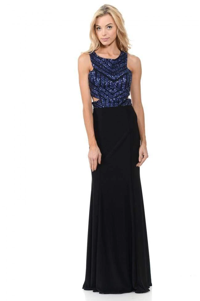 Heighten your charming appeal in Lenovia 5146. Envisions in a sleeveless, halter neckline with fitted bodice ornate with geometric sequins. The bodice is styled with side cutouts and features a full length sheath skirt. The night is yours in a spectacular gown from Lenovia.