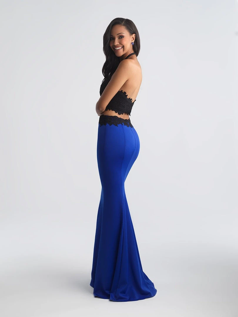 Sizzle and shine with this dress by Madison James 18-673. This dress is designed with a halter neckline and lace embellished bodice. This two piece dress is paired with a sheath skirt that also has lace details at the waist. While at the back is a skin revealing mid-open back design that ends with a zipper closure. This Madison James creation definitely parades the elegant and classy style.