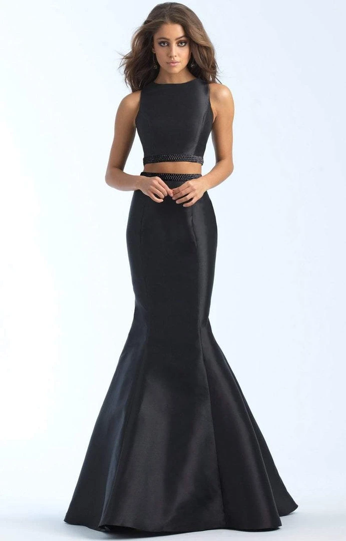 Shine with a chic and sweet style that flatters an hourglass figure in this sophisticated Madison James 18-731 creation. Elegantly crafted with seams on a sleek Mikado fabric, this lavish piece stuns with jewel neckline and a bow-accented cutout back on a cropped top. Trimmed with shimmering beaded bands along the midriff and the high waist, the mermaid skirt skims along the hips before flaring elegantly in waves that complete with a sweeping train. Look as exquisite as a regal goddess in this lustrous Madison James masterpiece.