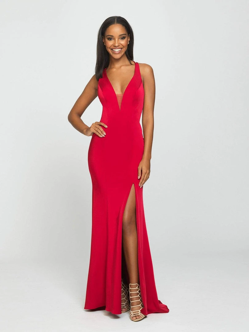 Look simple and chic in this luxe gown by Madison James 19-139. Mesmerizes in a sleeveless, deep V-neckline with sheer inset at mid-bust. The fitted bodice is styled in triple stranded straps across the open back. The skirt has a fit and flare silhouette and is designed with a slit and sweep train finish. Be the center of attention on your next formal occasion in this Madison James creation.