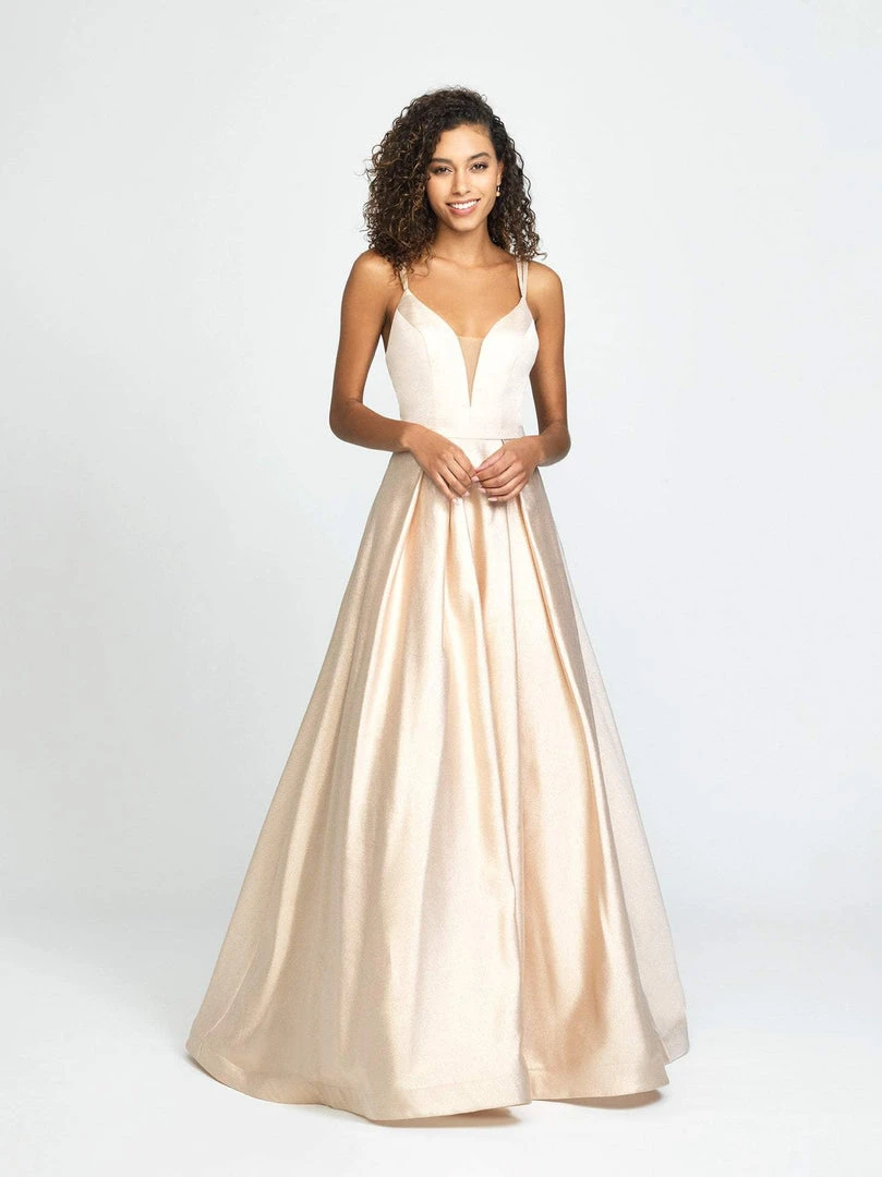 Look sweet and demure in this glitter mikado dress by Madison James 19-176. Enchants in a sleeveless, deep V-neckline with sheer inset at mid-bust. The fitted bodice is styled with dual spaghetti straps and accents the back with a bow detail. The waist is wrapped in a thin belt and begins a full length pleated A-line skirt. All eyes will be on you in this elegant evening gown by Madison James.