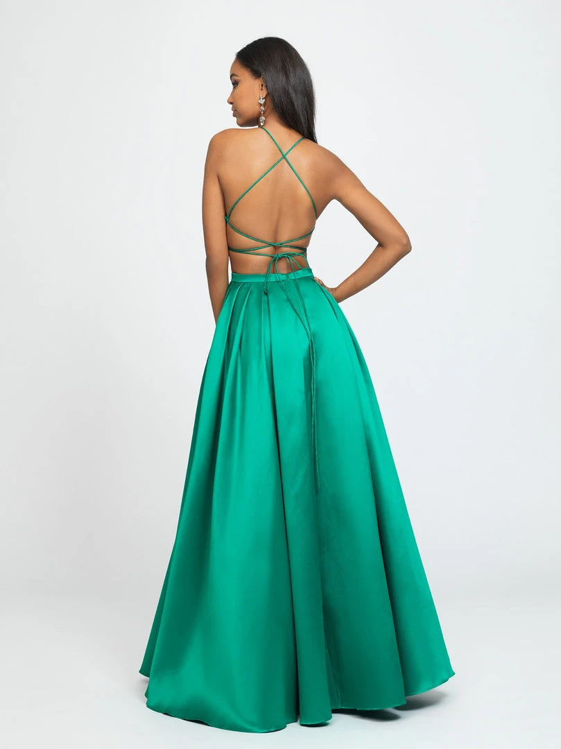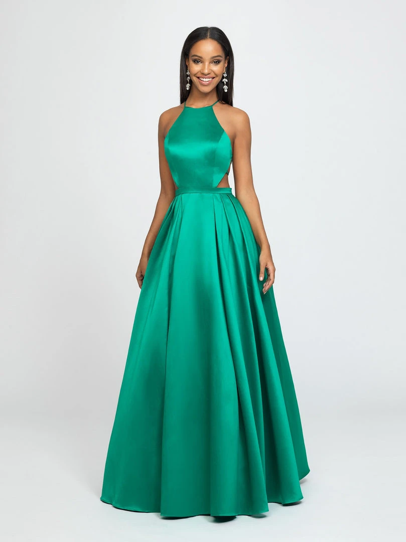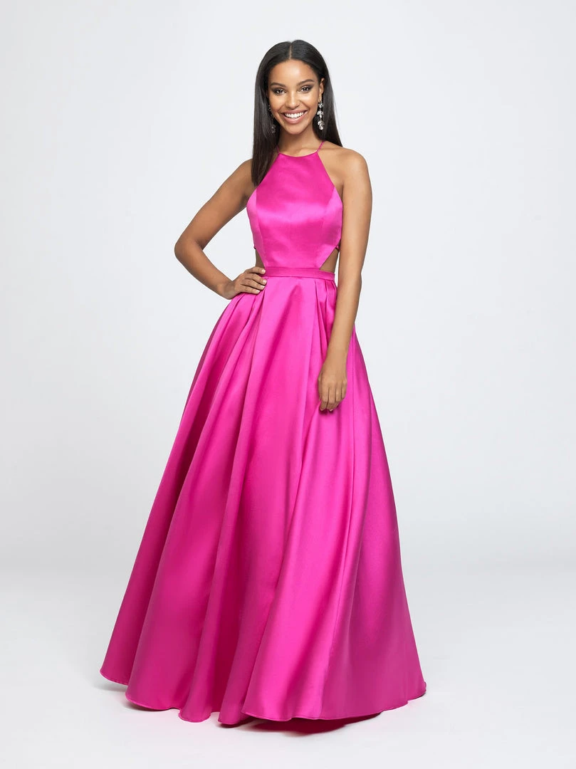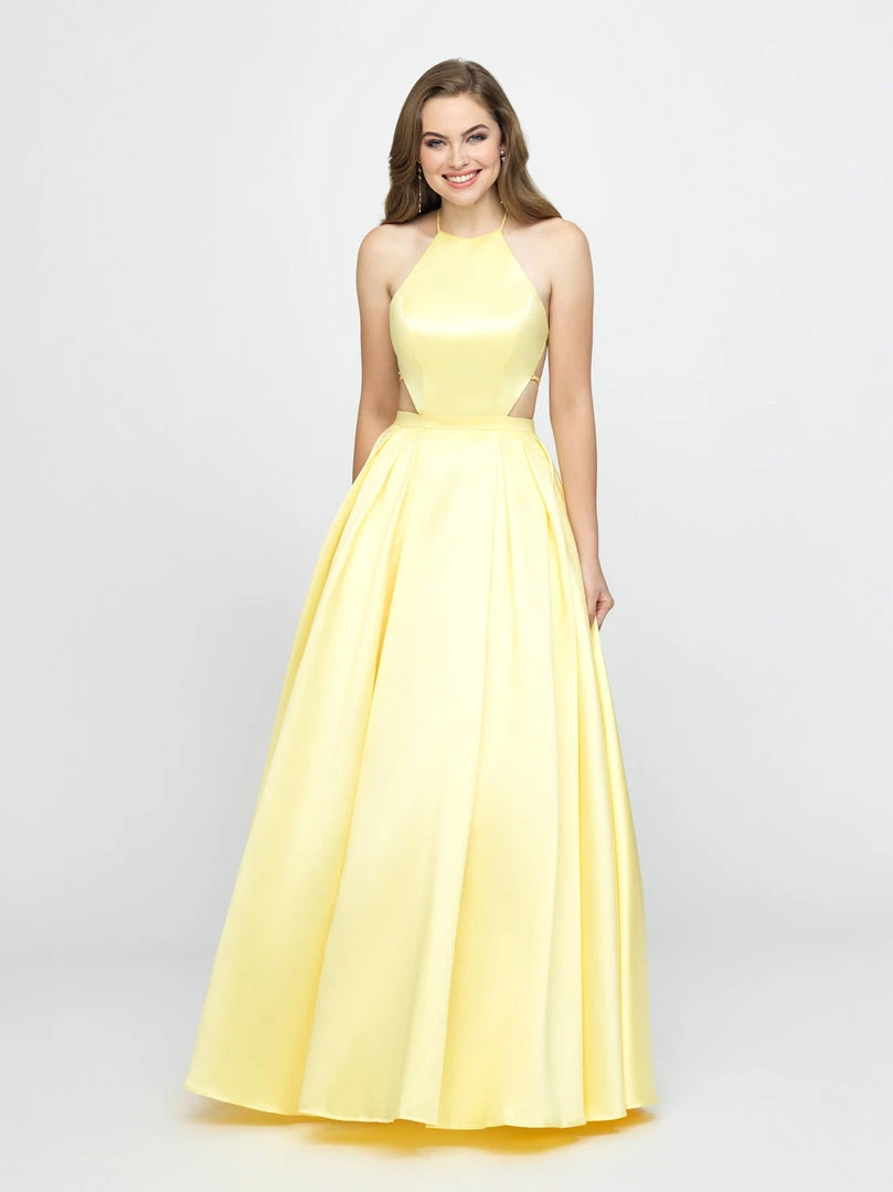 Embrace a wonderful evening in this wondrous formal gown by Madison James 19-186. This mikado dress glams in a sleeveless, halter neckline with fitted bodice styled with side cutouts and a tie back. The waist is wrapped in a thin band and flourishes a full length pleated A-line skirt. The back has a zipper closure. This gorgeous dress by Madison James is charming and versatile, perfect for red carpet events, social galas, destination weddings and prom.