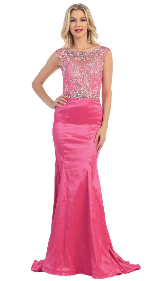 Look immaculately gorgeous when you don in this glamorous masterpiece from May Queen MQ 1119. An illusion bateau neckline with sheer cap sleeves top this evening gown. Crystal embellishments beautifully adorn the bodice which will make you sparkle from the crowd. Fitted through the hips, the skirt flares elegantly to the floor finished off with a sweep train adding a dramatic touch. An apparent V cut highlights the back with a center zipper closure that secures the ensemble. Bring on the glam with this May Queen creation.