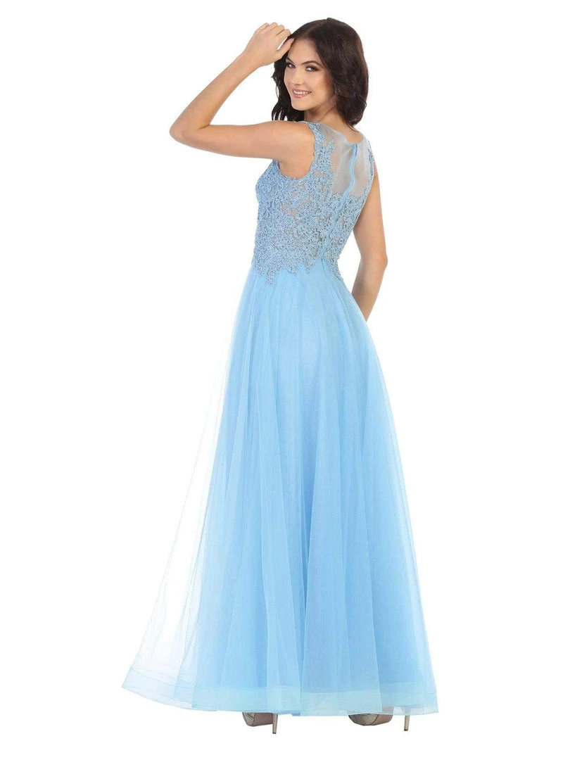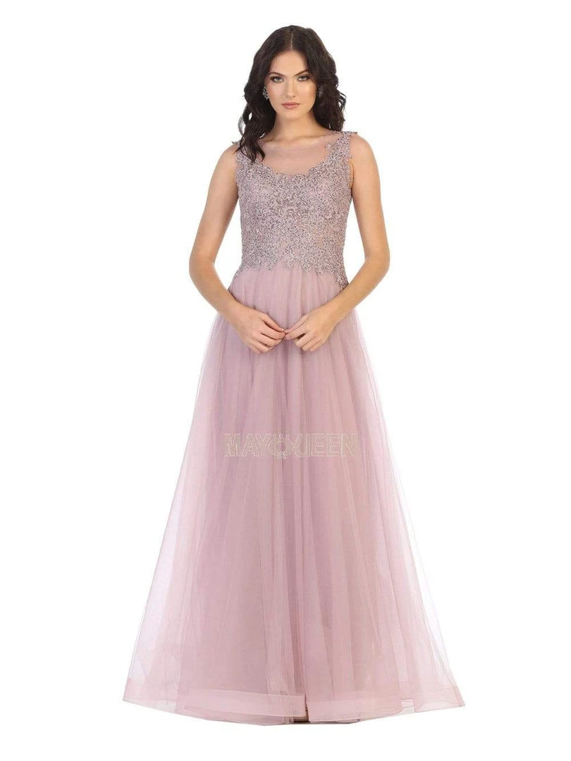 Make such a classy vision on the red carpet in this May Queen MQ1716 creation. Ornamented with rhinestones and lace appliques, this dress showcases a sheer bodice with an illusion scoop neckline. The sheer full back is designed with a zipped up closure. The tulle skirt flares into a full-length hemline. Glide into the room and shine in this May Queen masterpiece.