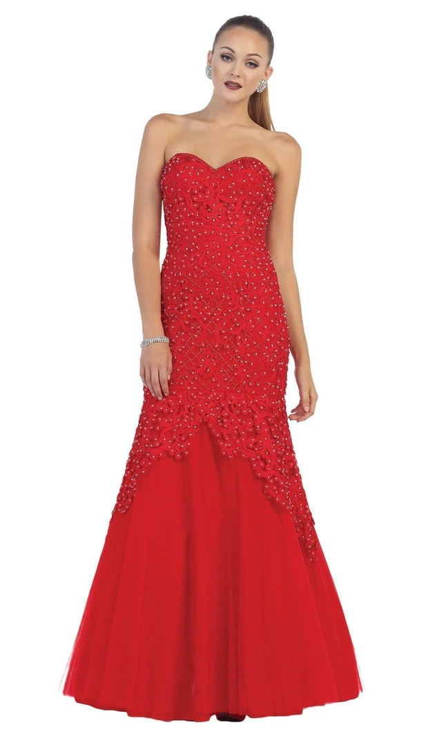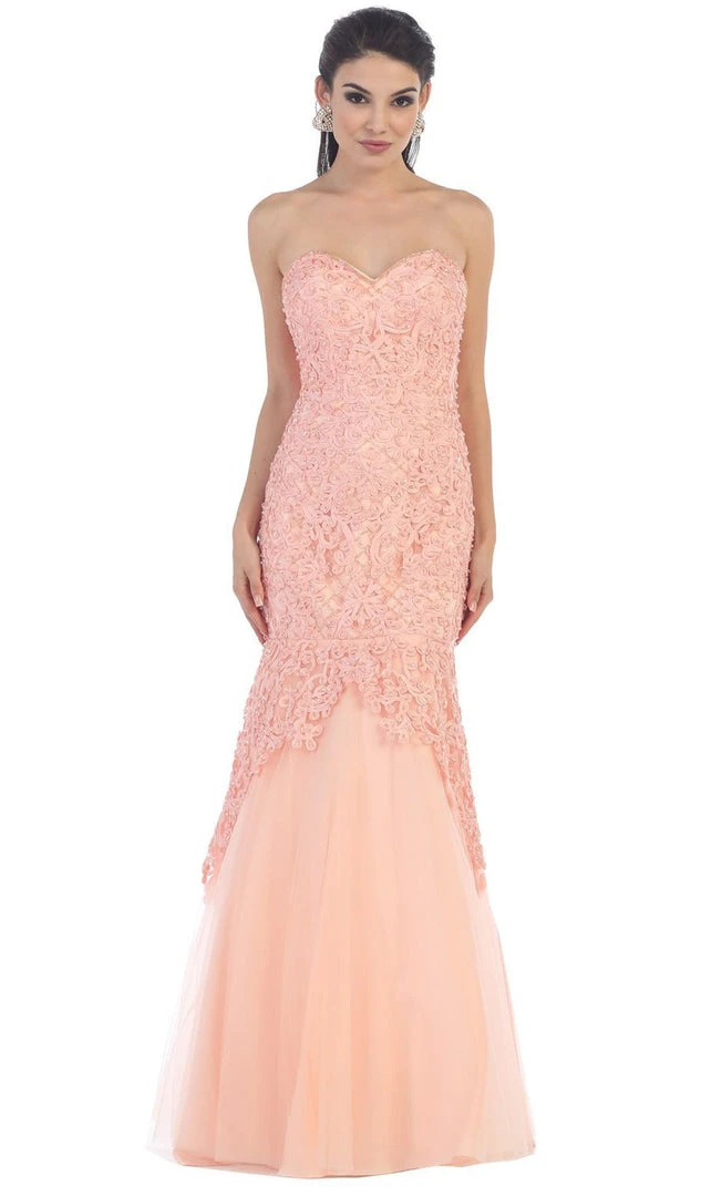 Make a statement with this dress by May Queen RQ7445. This strapless dress offers a sweetheart neckline with lace and embroidered detailed bodice. This dress also has embellished details providing that spark for added elegance. This mermaid skirt creation also has a mid-open back design with lace up closure. This May Queen creation definitely parades the elegant and classy style.