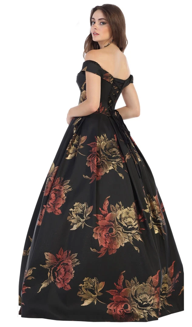 Optimize the attraction of your special event in this alluring gown by May Queen RQ7675. Brandishes in a deep off the shoulder neckline with mesh at fitted bodice. The back has a lace up closure for an adjustable fit. From the waist begins a pleated, floral patterned ballgown skirt. Walk in a defined sophistication and beauty wearing May Queen.