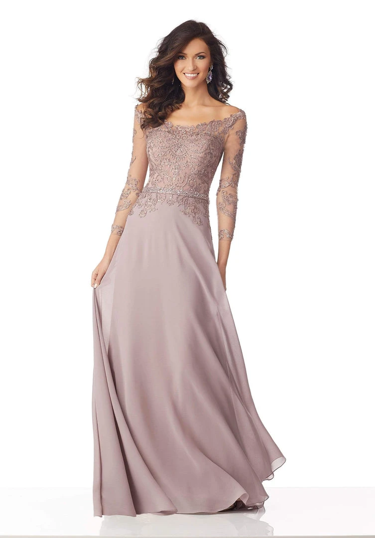Enhance your visual appeal in this luxurious dress by MGNY By Mori Lee 71806. This embroidered dress enchants an off the shoulder neckline with sheer long sleeves. The dress has a fitted bodice and flourishes a full length A-line skirt. Standout among the fabulous crowd as all eyes focus on you in this glamorous MGNY By Mori Lee creation. Model is wearing Dusty Rose color.