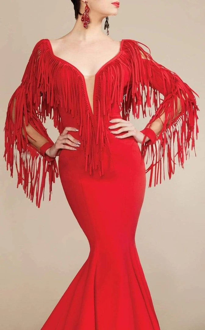 Dress to the nines in this glam dress by MNM Couture 2340. This dress flaunts cutaway sleeves with fringes that adorn the sleeves up to the plunging V-neckline. The mid-bust has a sheer inset on this fitted bodice and leads to the floor length mermaid skirt with a sweep train. This MNM Couture ensemble is your excellent pick when you dare to look stylishly spectacular!