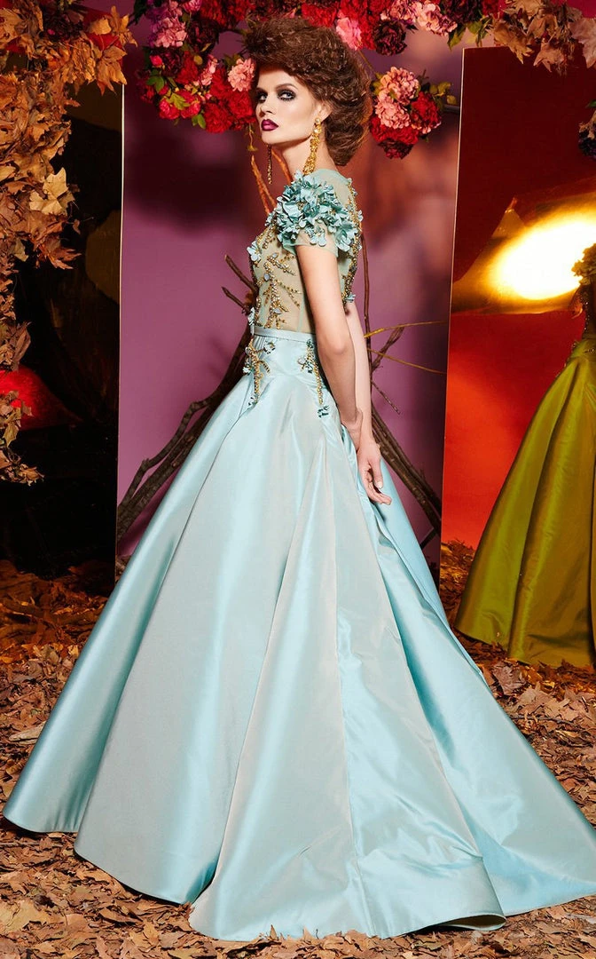 Impress everyone with your immaculate penchant for the artistically inspired in this classy MNM Couture 2430 creation. Handsomely decorated with shimmering branch-like beadwork accented with opalescent jewels, this couture piece shows an illusion jewel over a sweetheart neckline. Delicately framed with sheer short sleeves emphasized with 3D floral appliques and an illusion full back, the waist is alluringly cinched with a tonal belt for that flattering fit. Richly volumized, godet treatments cascade down its span as it falls to brush the floor with a full-length hem and a sweeping train. Be the very image of exceptional taste as you don this lovely MNM Couture masterpiece. Model is wearing the Turquoise color.