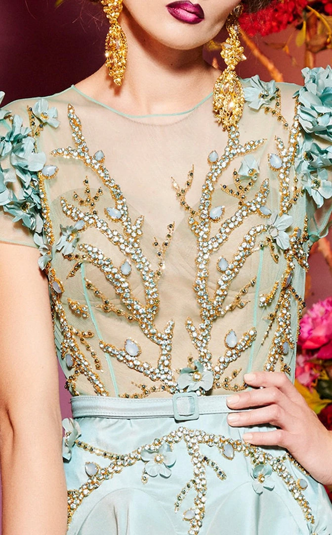 | Details: | Jeweled Branch Beadwork, Sheer Bodice, 3D Floral Appliques, Short Sleeves, Tonal Belt, Godet Details, Illusion Back, Back Zipper Closure, Sweep Train |