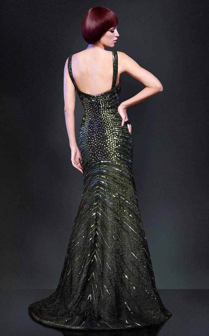 Exude luminous glamour as you engage the entire night in frivolous fun in this intricately embellished MNM Couture 8291 creation. Overlaid with a sheer tulle fabric glittering with beautiful sequins, this stunner has a sweetheart neckline framed with slender shoulder straps that traverses down its curved mid-open back. Radiating iridescence from a crystal paneled ornament flowing at its center until the dropped waist, a highly radiant flare of the trumpet skirt flares gorgeously down to a glorious sweep of train. Exude lustrous beauty as you grace every important event in this resplendent MNM Couture masterpiece.