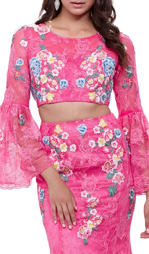 | Details: | Two-piece dress, Round neckline, Flared long sleeves, Lace and floral embroidery, Mermaid skirt, Back with keyhole opening, Zipper closure |