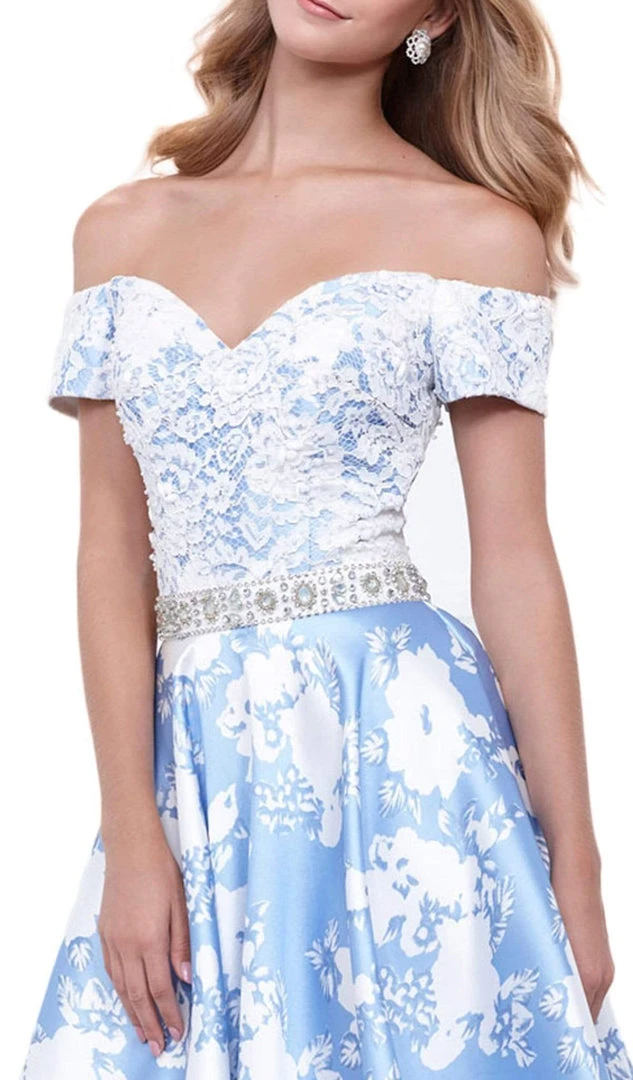 Classy and refreshing, bloom with loveliness in this detailed Nox Anabel 8301 creation. Featuring an off-shoulder bodice of lace details, this beauty shows off an embellished waistband. The full A-line skirt traverses to the ground in subtle floral print. This gorgeous Nox Anabel masterpiece will let you celebrate that divine feminine beauty!