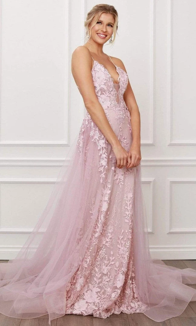 Heighten your charming appeal with this creation from Nox Anabel F485. This beautiful beaded lace dress makes a statement in a sleeveless, deep V neckline with sheer inset at mid-bust. The fitted bodice is supported with thin straps and is styled with a strappy back. The trumpet skirt is matched with a chiffon overskirt with a train and horsehair hemline. Unleash an inner glamour that attracts all eye on you in this Nox Anabel masterpiece.