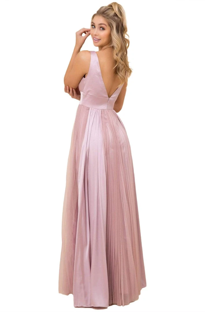 Embrace stunning simplicity and elegance in this exquisite Nox Anabel L340 creation. Impressively rendered with minute ruching along the bodice, this dress flaunts a deep v-neckline with a sheer inset. The back is fascinatingly plunged with a v-open design. Embraced along the midriff with an empire band, the pleated A-Line skirt is exceptionally blended with opaque and sheer panels that falls into a sweeping train. Be the embodiment of sophistication in this fantastic Nox Anabel masterpiece.